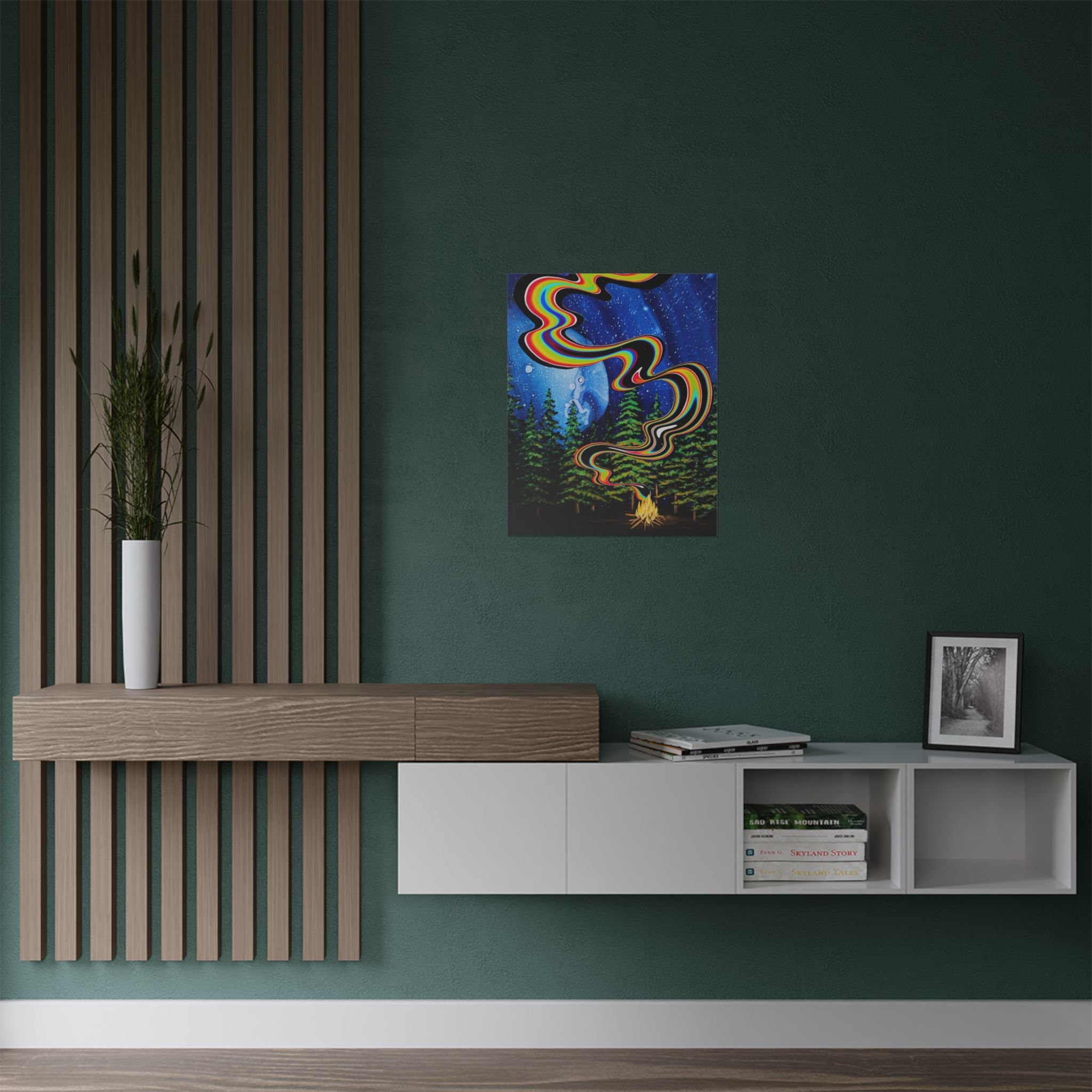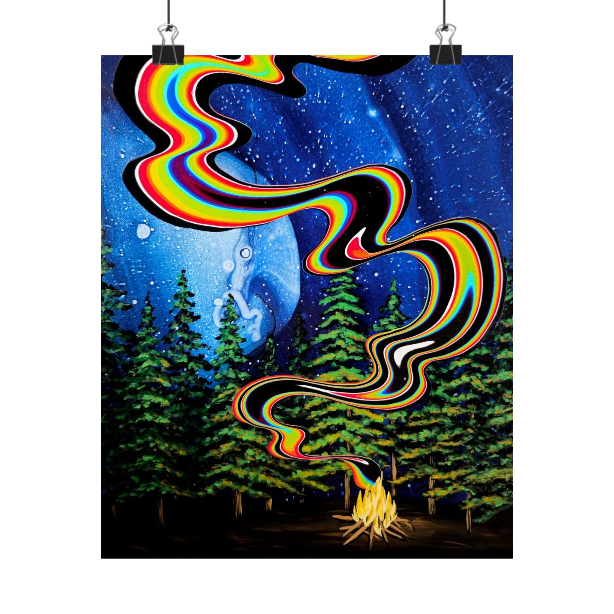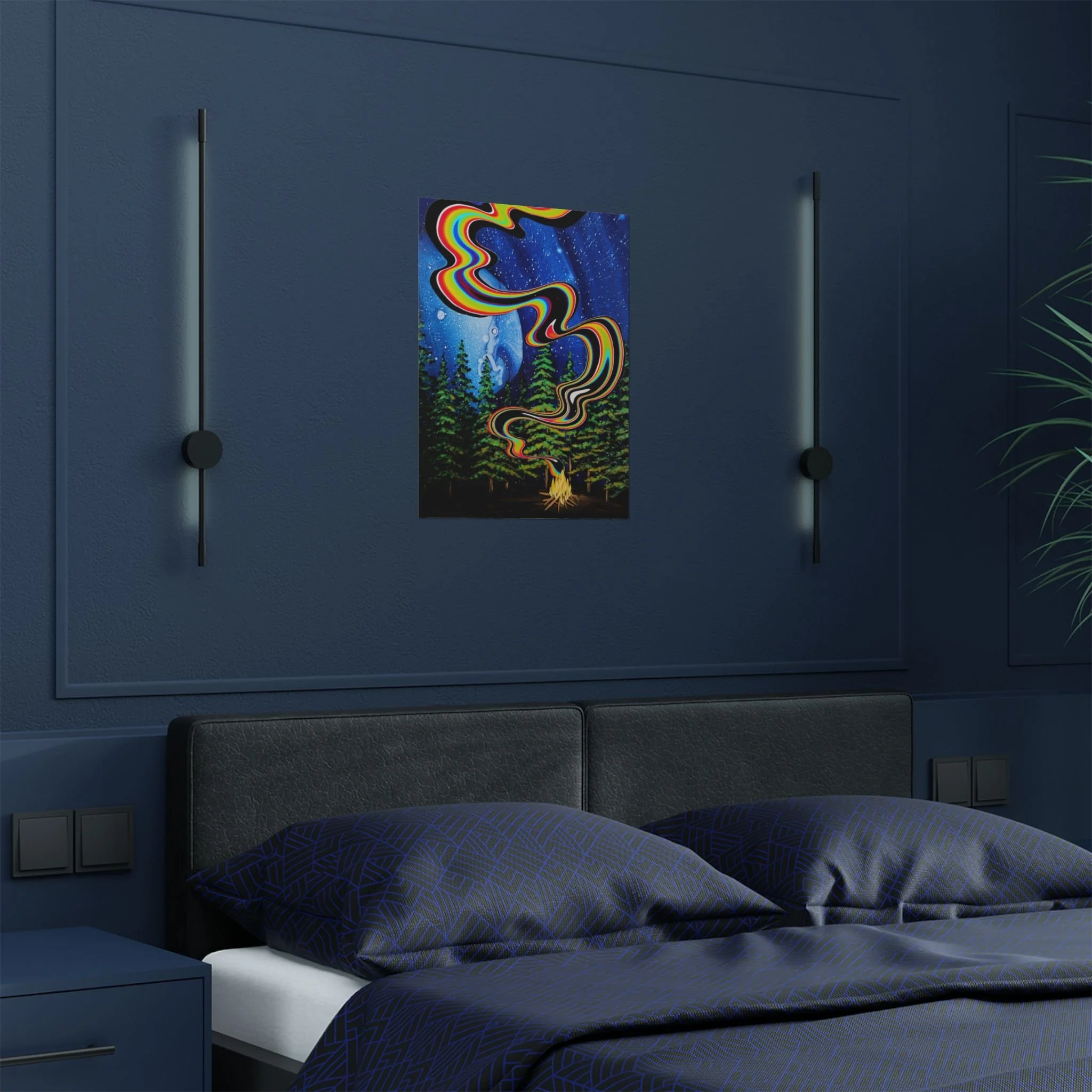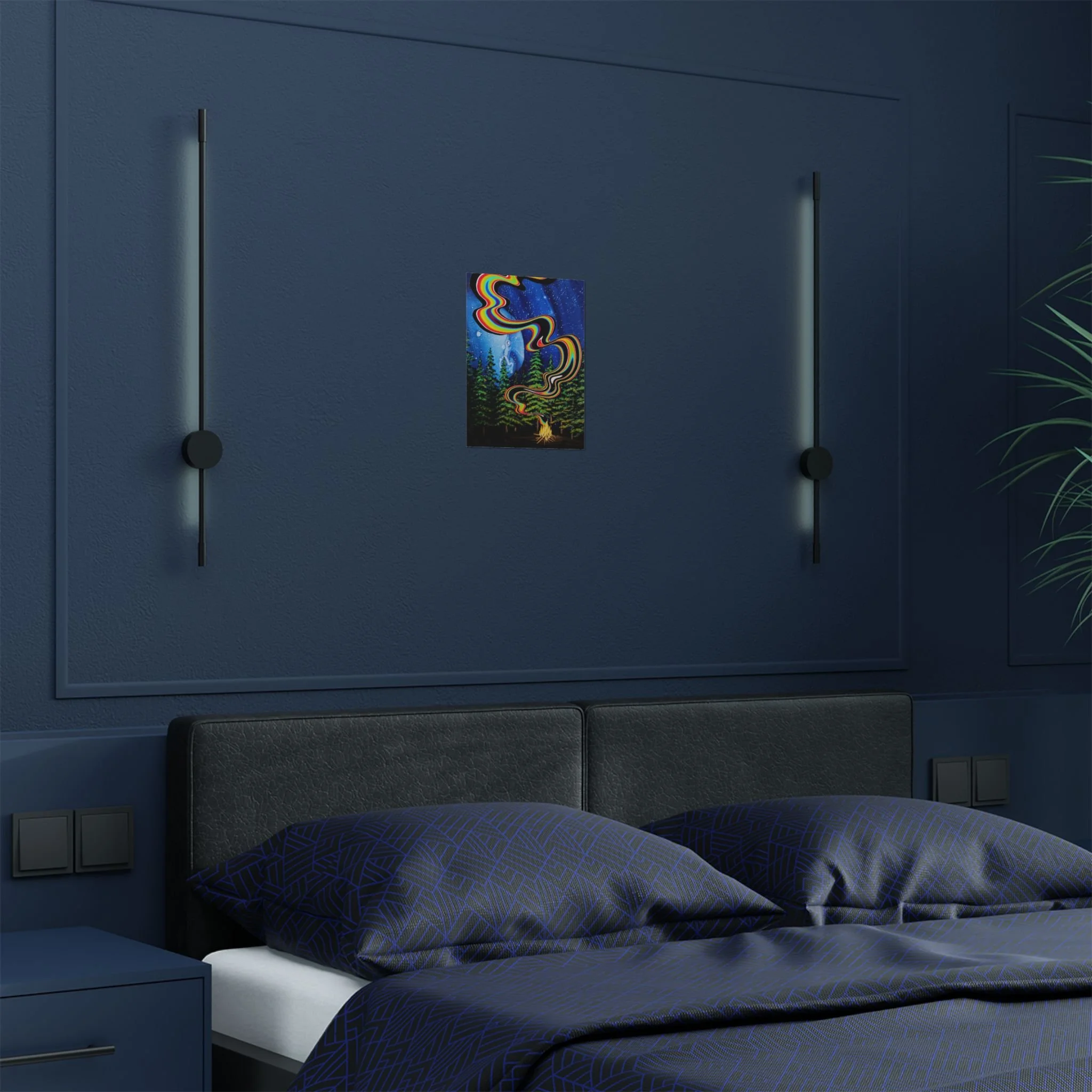 This satin poster captures a midnight forest scene where a crackling campfire sends a ribbon of rainbow light up into a star-speckled sky. Printed on museum-grade 300gsm satin paper, the imagery stays vivid and true — colors pop without harsh shine, and fine details remain crisp. Hang it above a record shelf, next to a reading nook, or lean it on a mantel to bring a gentle, otherworldly energy to a room. It reads like a memory of nights spent under pines: warm embers, cool air, and a slow wash of color that turns ordinary walls into a place that feels lived-in and luminous.