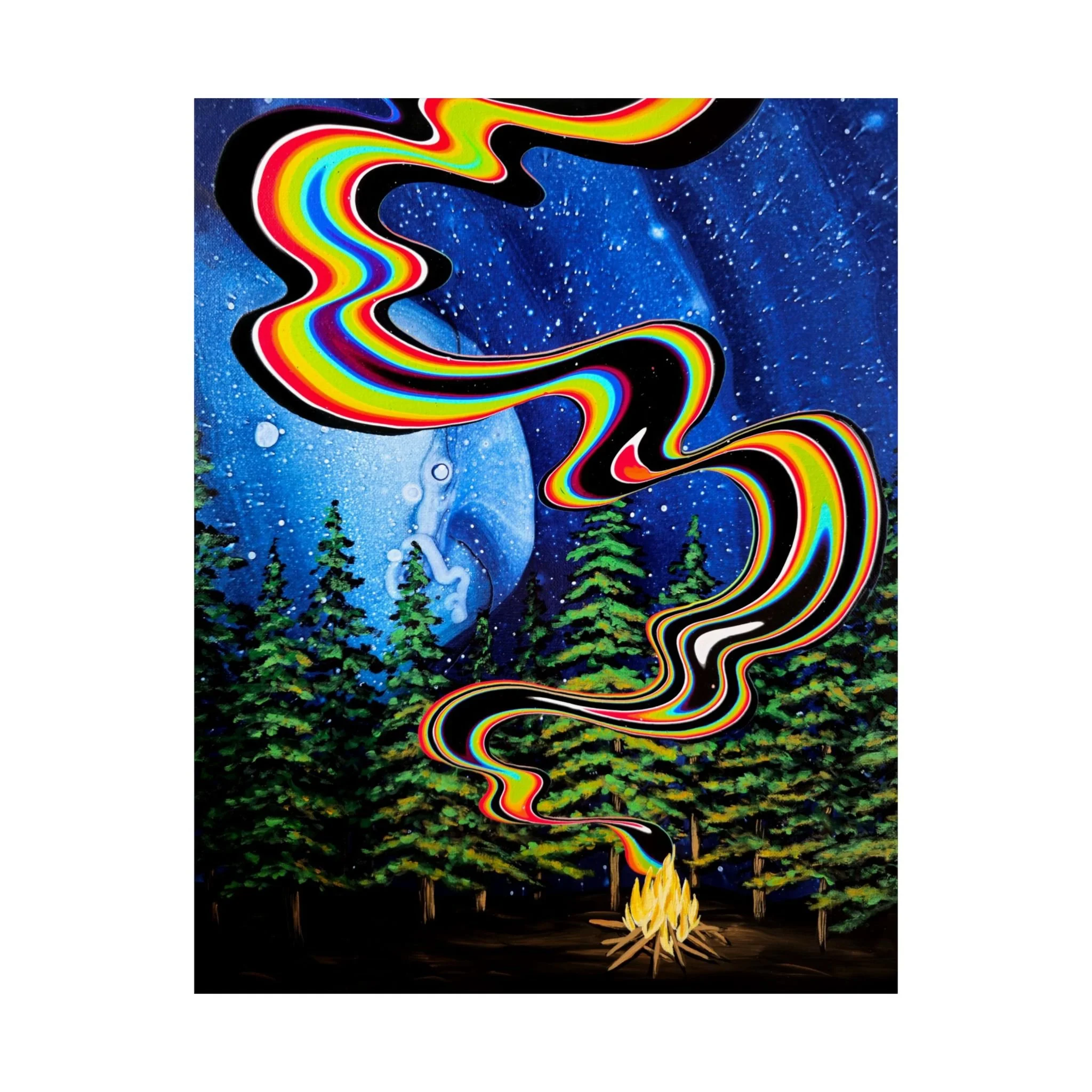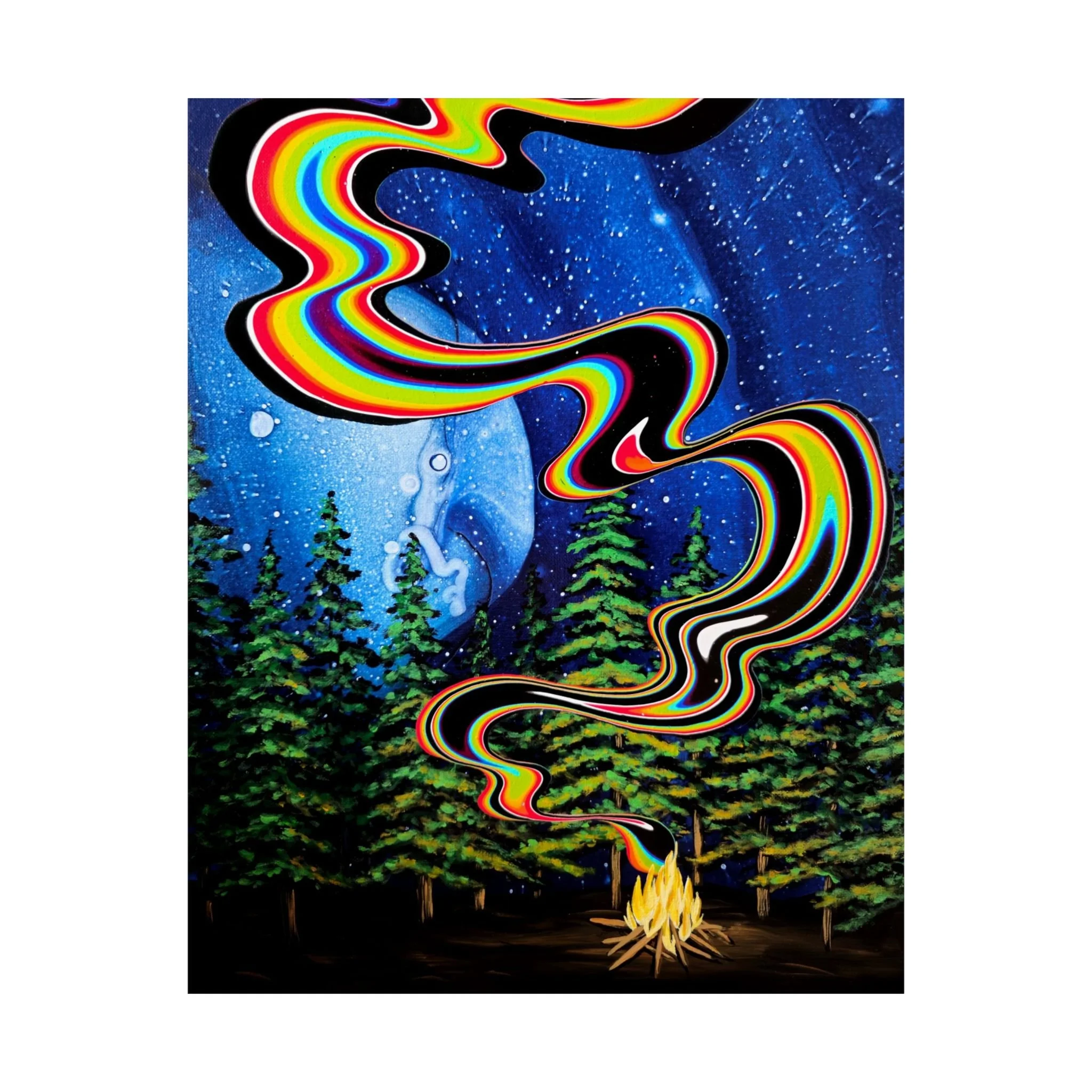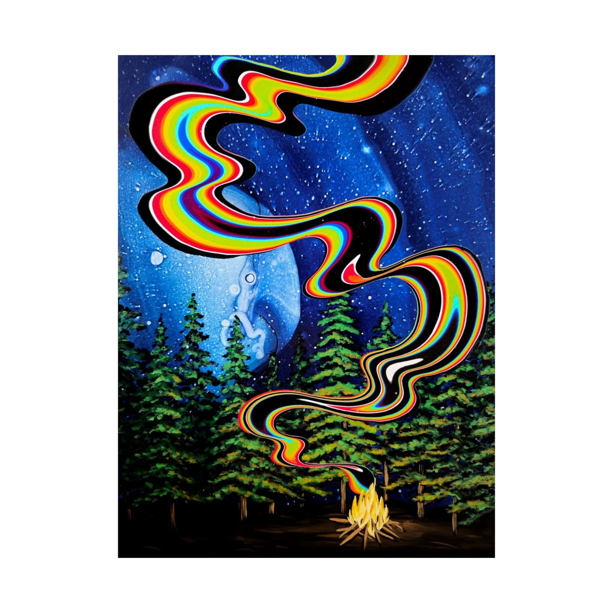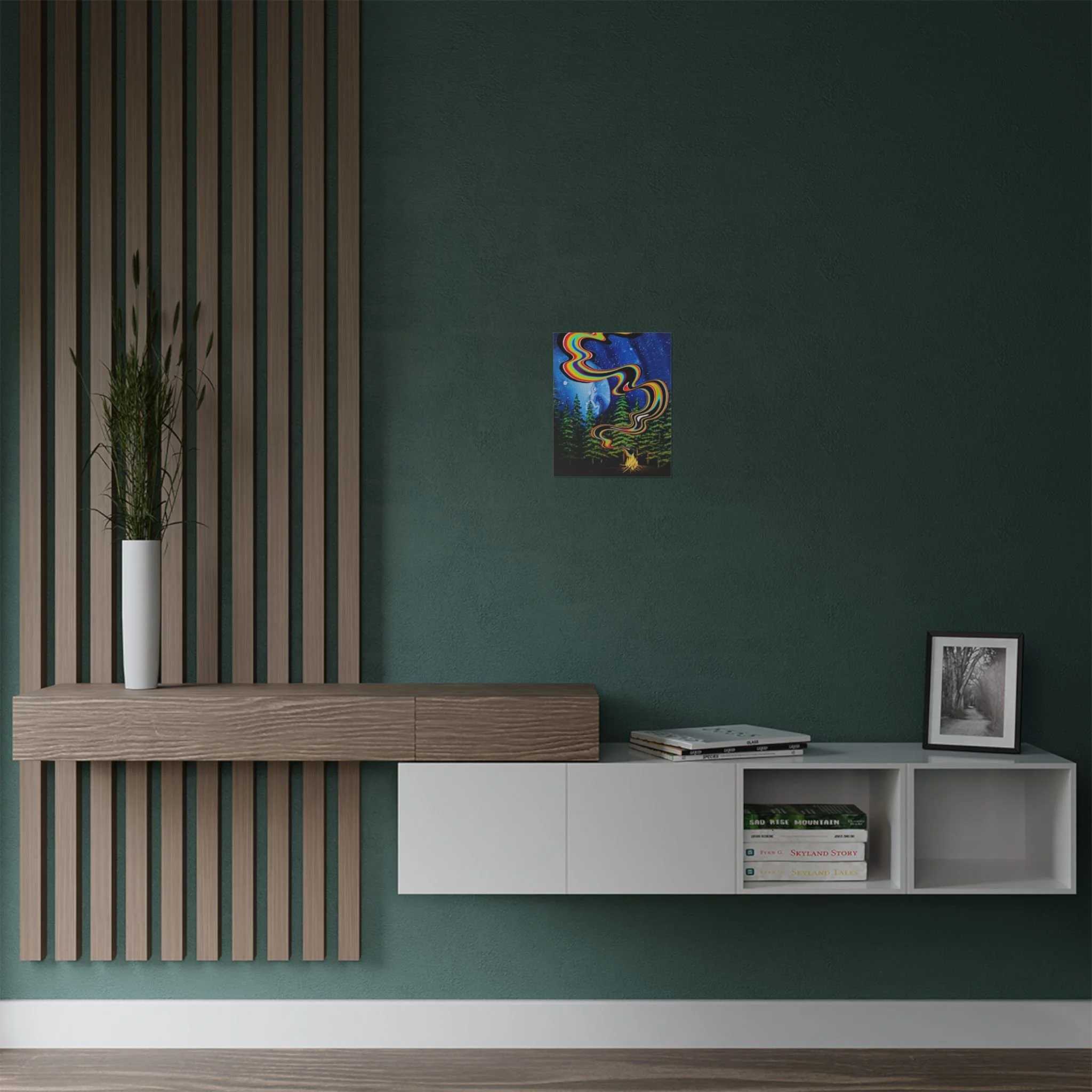 This satin poster captures a midnight forest scene where a crackling campfire sends a ribbon of rainbow light up into a star-speckled sky. Printed on museum-grade 300gsm satin paper, the imagery stays vivid and true — colors pop without harsh shine, and fine details remain crisp. Hang it above a record shelf, next to a reading nook, or lean it on a mantel to bring a gentle, otherworldly energy to a room. It reads like a memory of nights spent under pines: warm embers, cool air, and a slow wash of color that turns ordinary walls into a place that feels lived-in and luminous.
