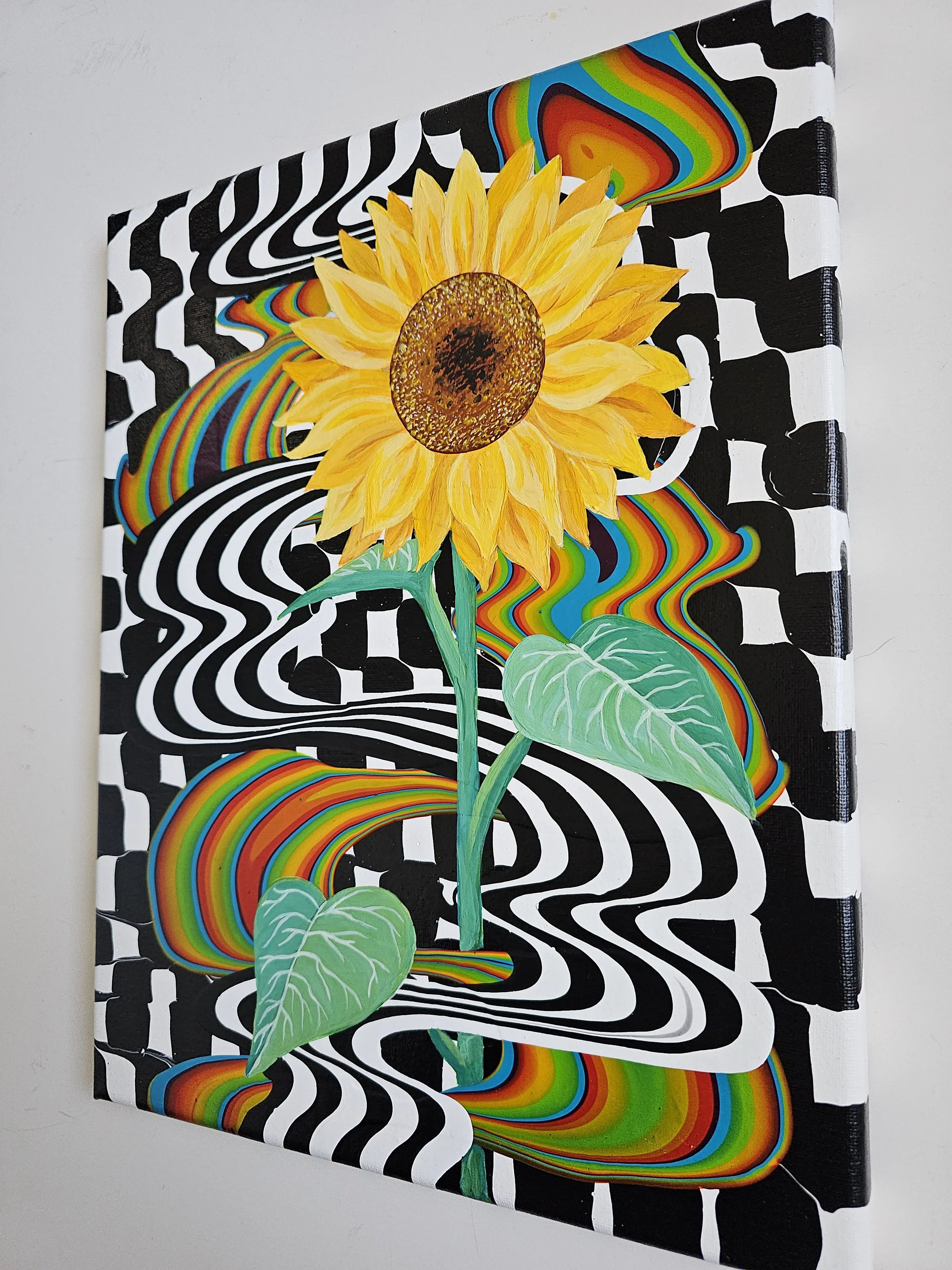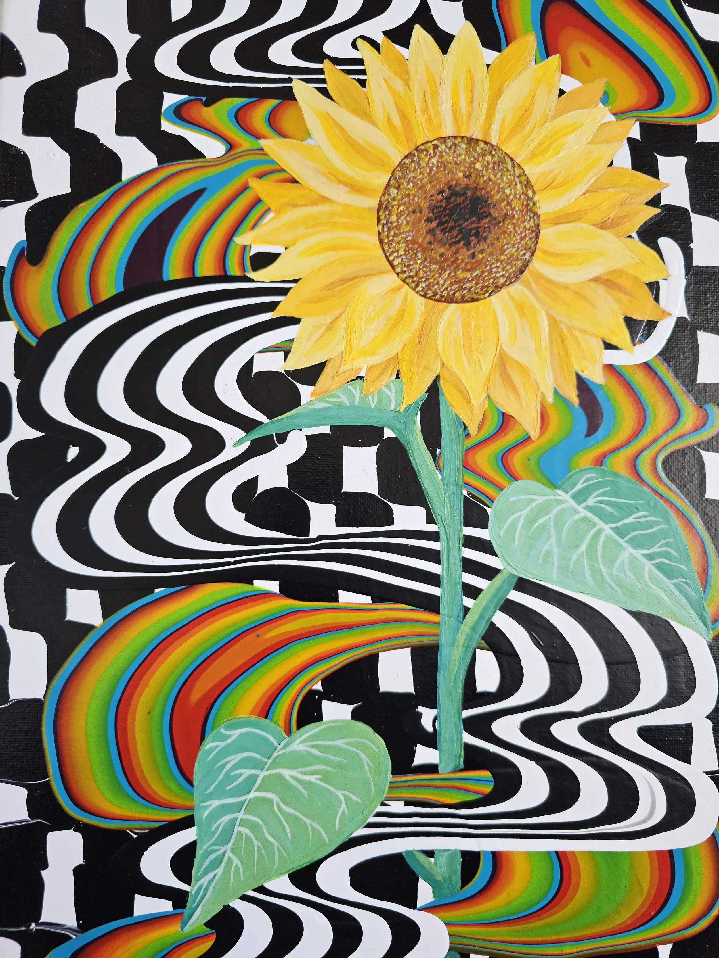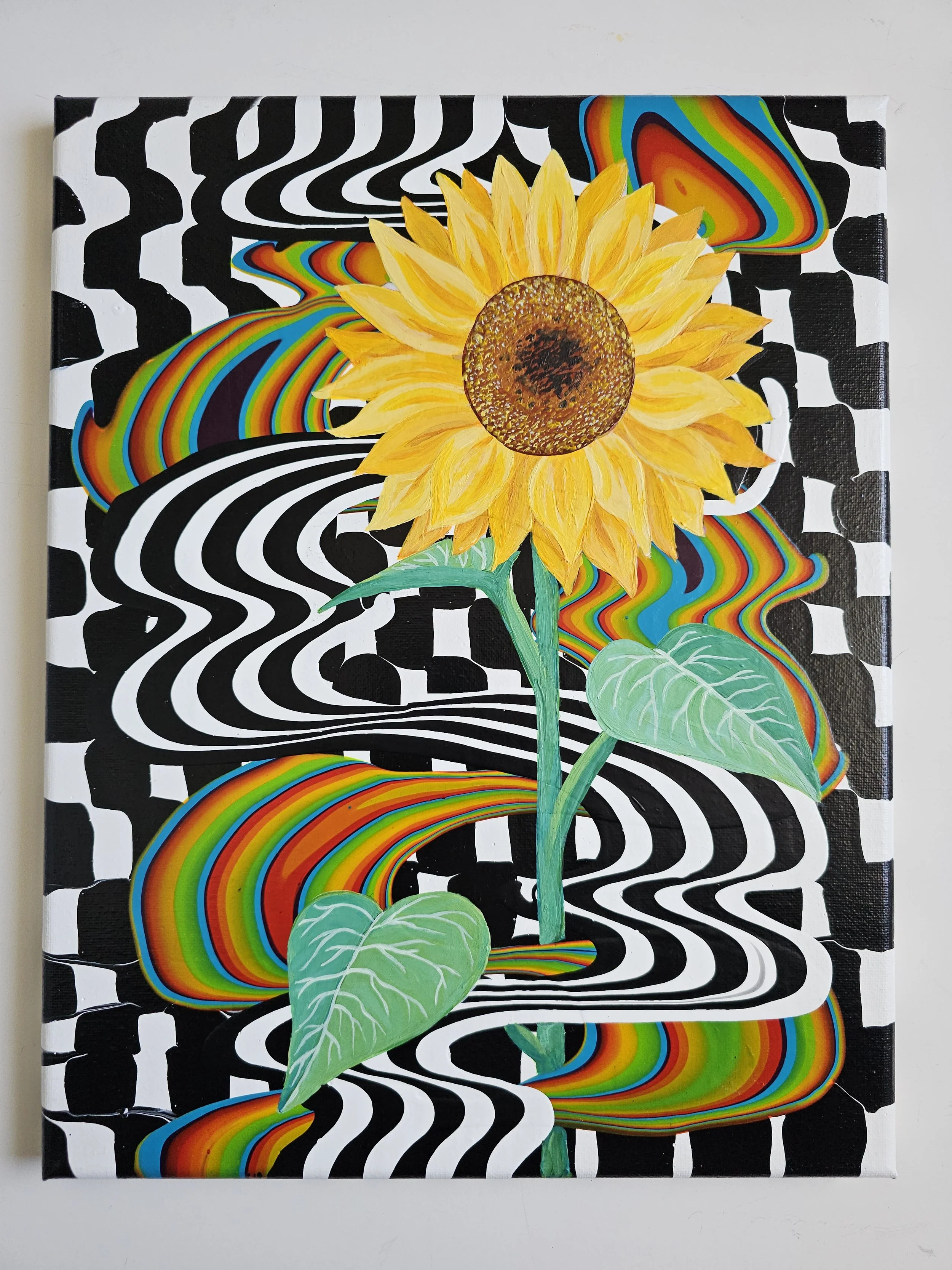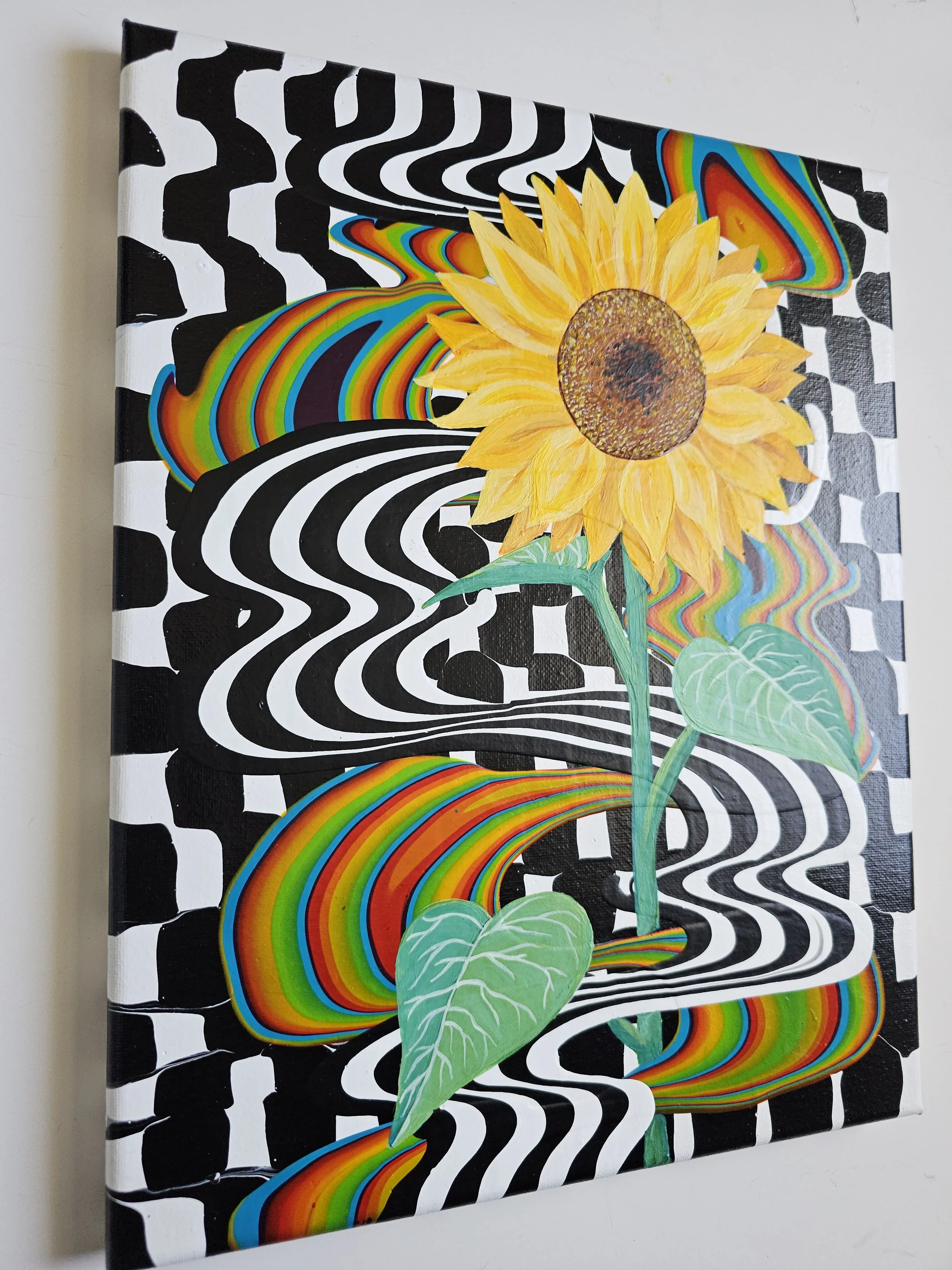 Bold, vibrant, and full of life, this striking sunflower rises from a hypnotic swirl of black-and-white movement and flowing color. The contrast between structure and fluidity creates a sense of energy and transformation, while the radiant bloom stands as a symbol of joy, resilience, and growth. Eye-catching and uplifting, this piece brings a modern, playful spirit to any space.