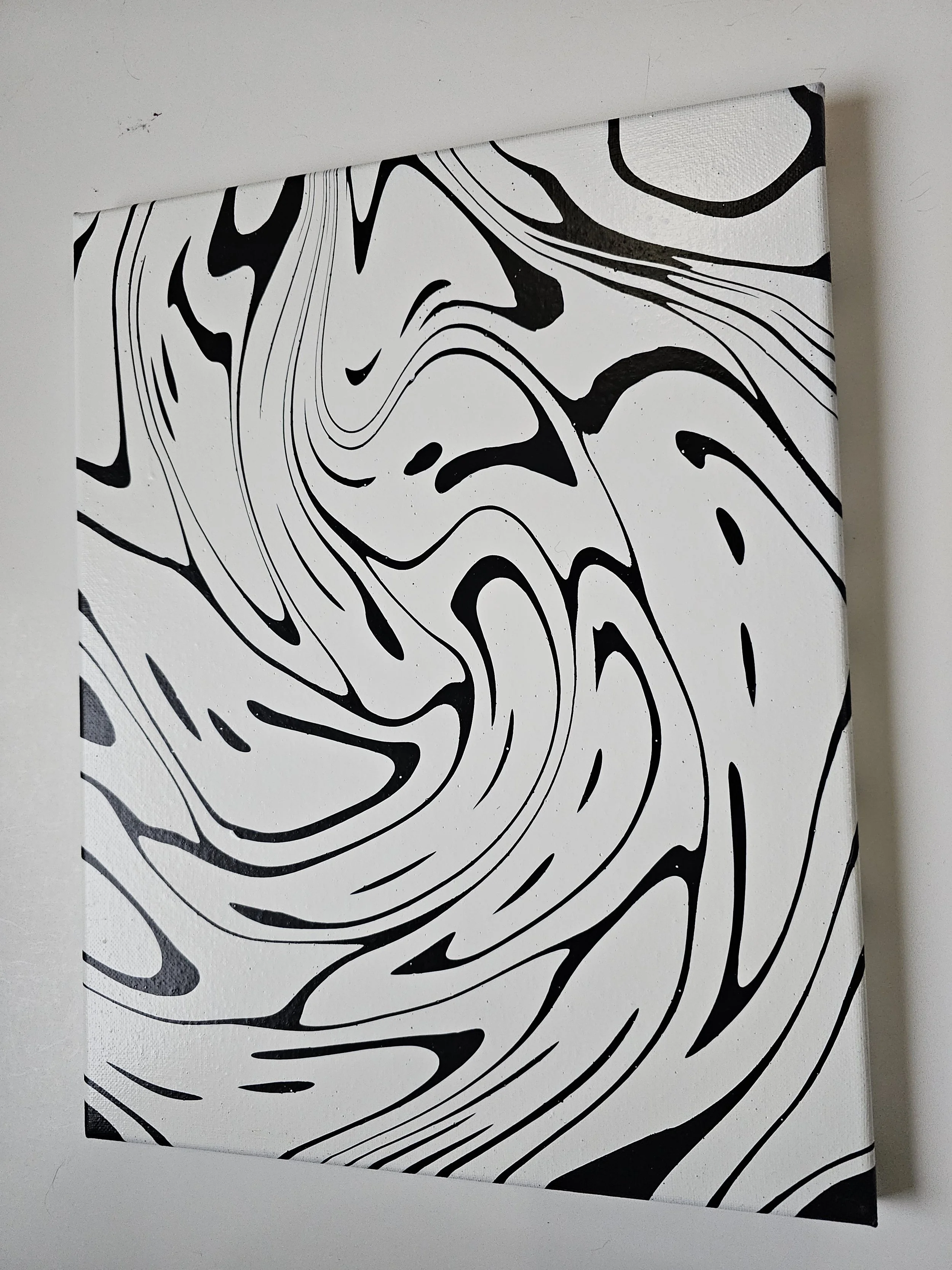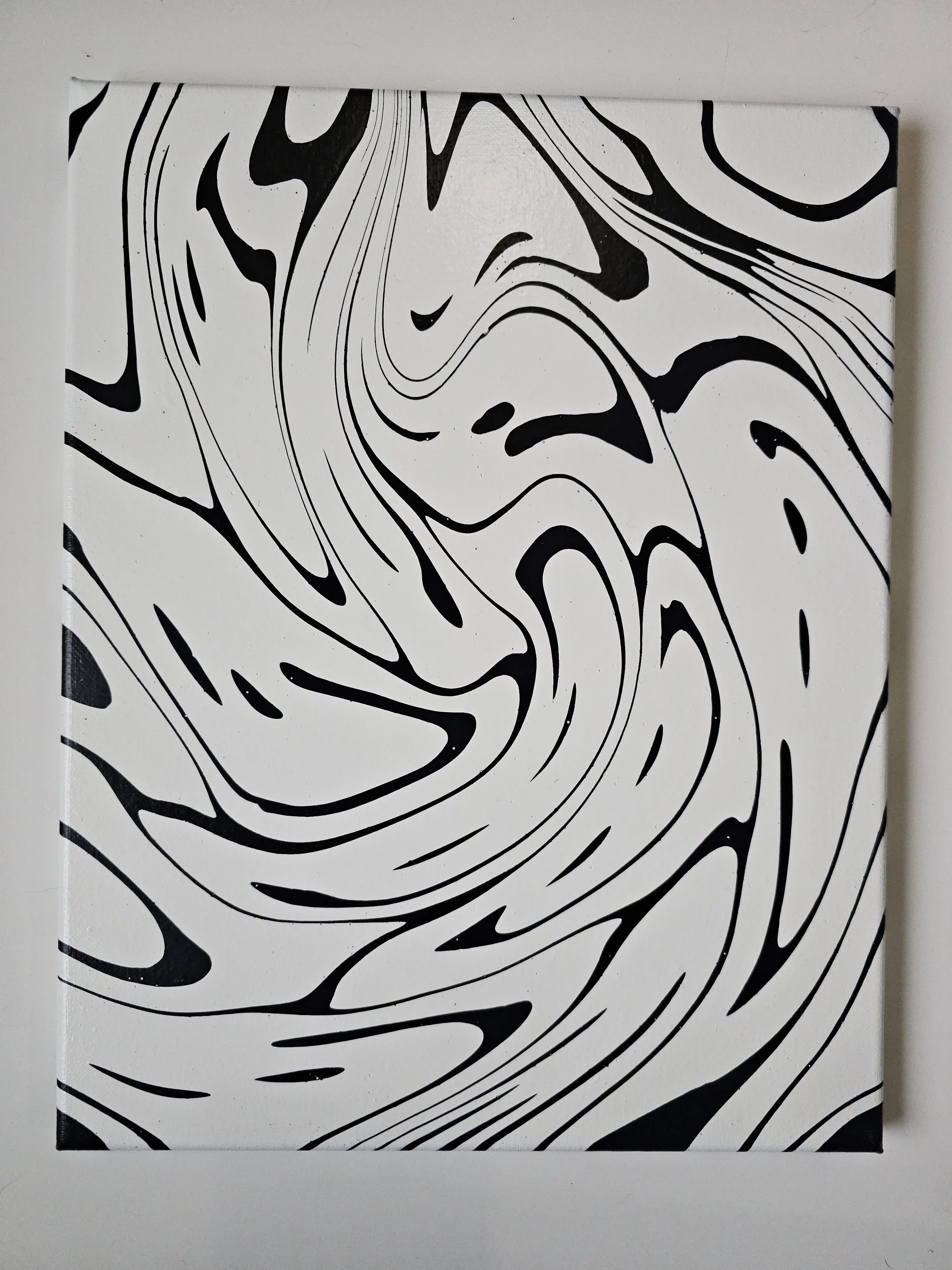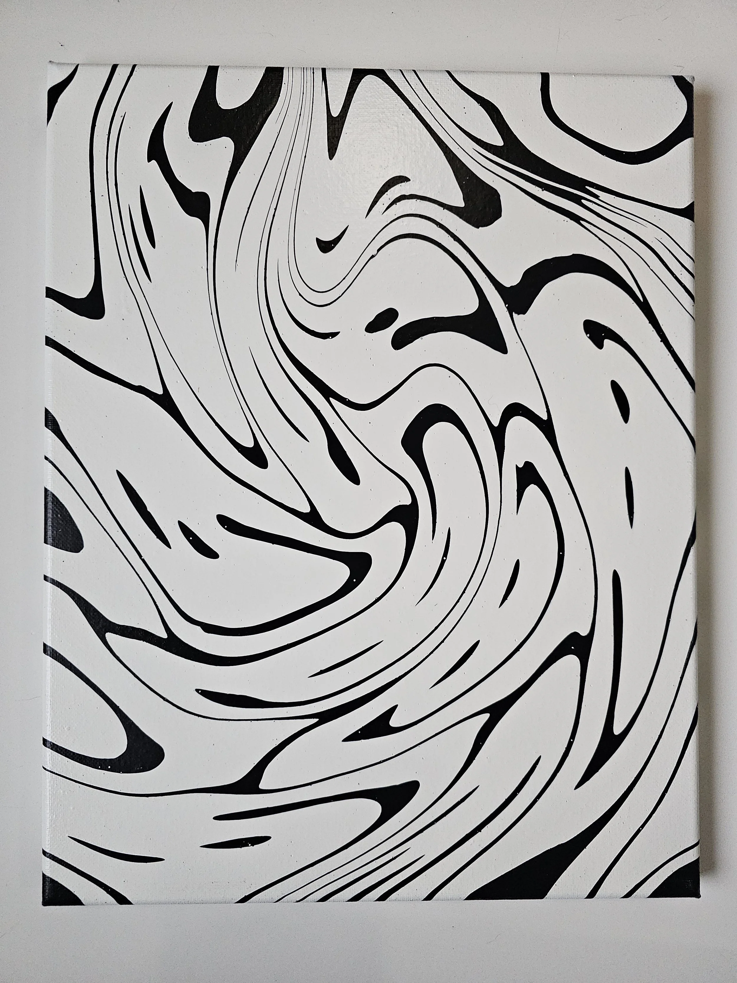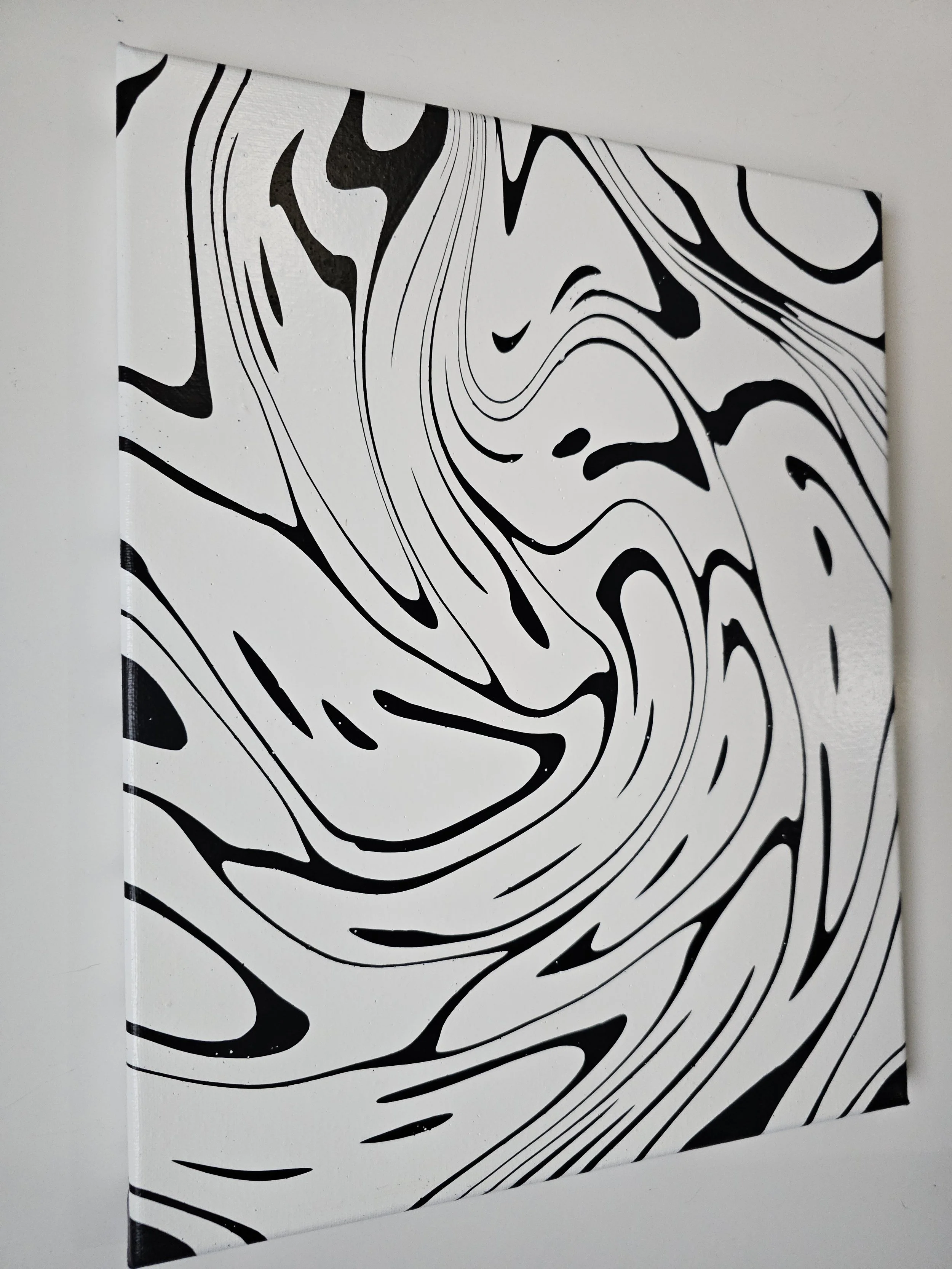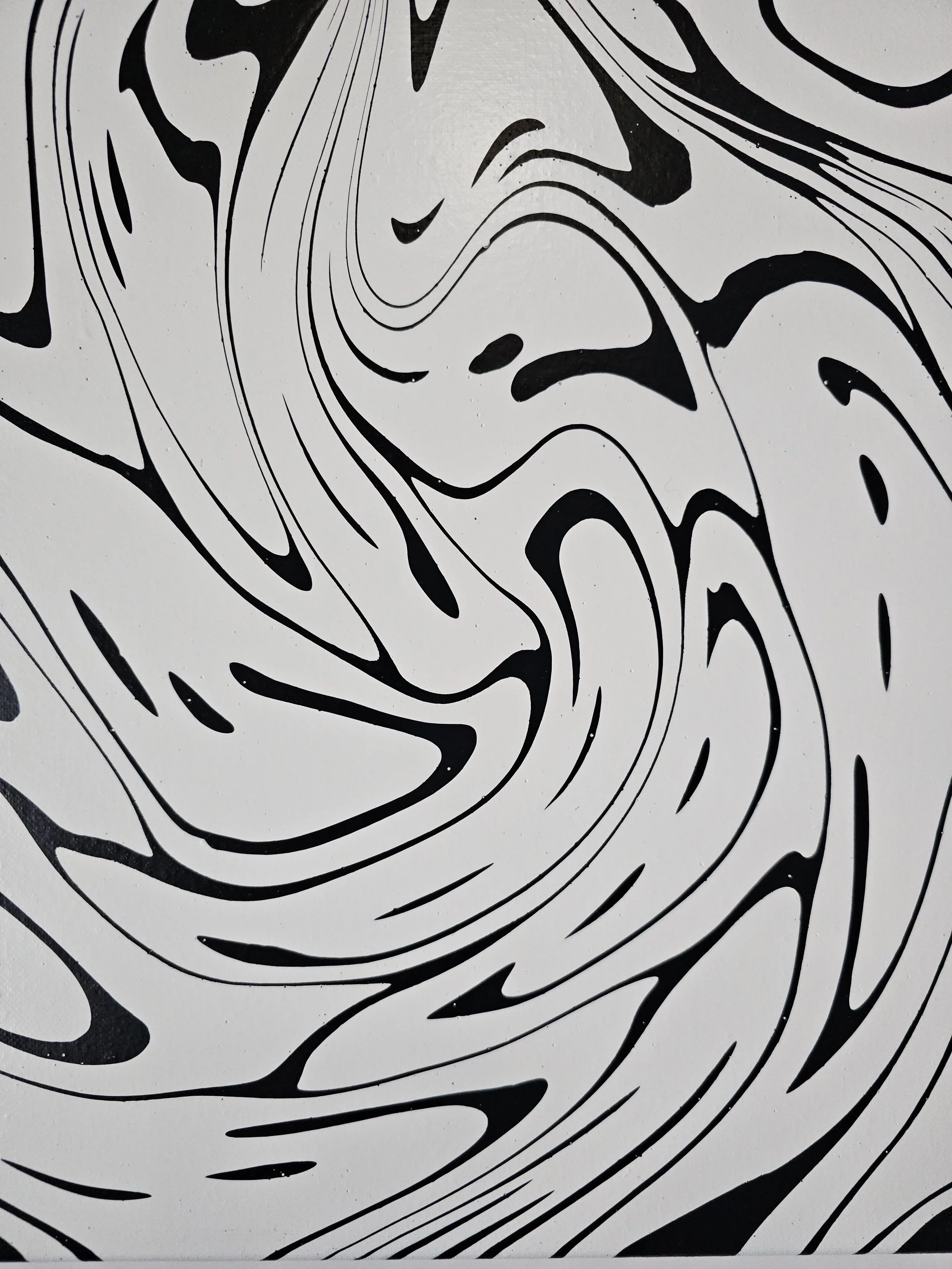 This black-and-white abstract painting blends fluid motion with playful surprise. What first appears as swirling, ink-like patterns reveals a series of hidden smiley faces woven seamlessly into the design. The result is a modern, minimalist piece that balances sophistication with a whimsical, uplifting twist — a perfect conversation starter for any contemporary space.