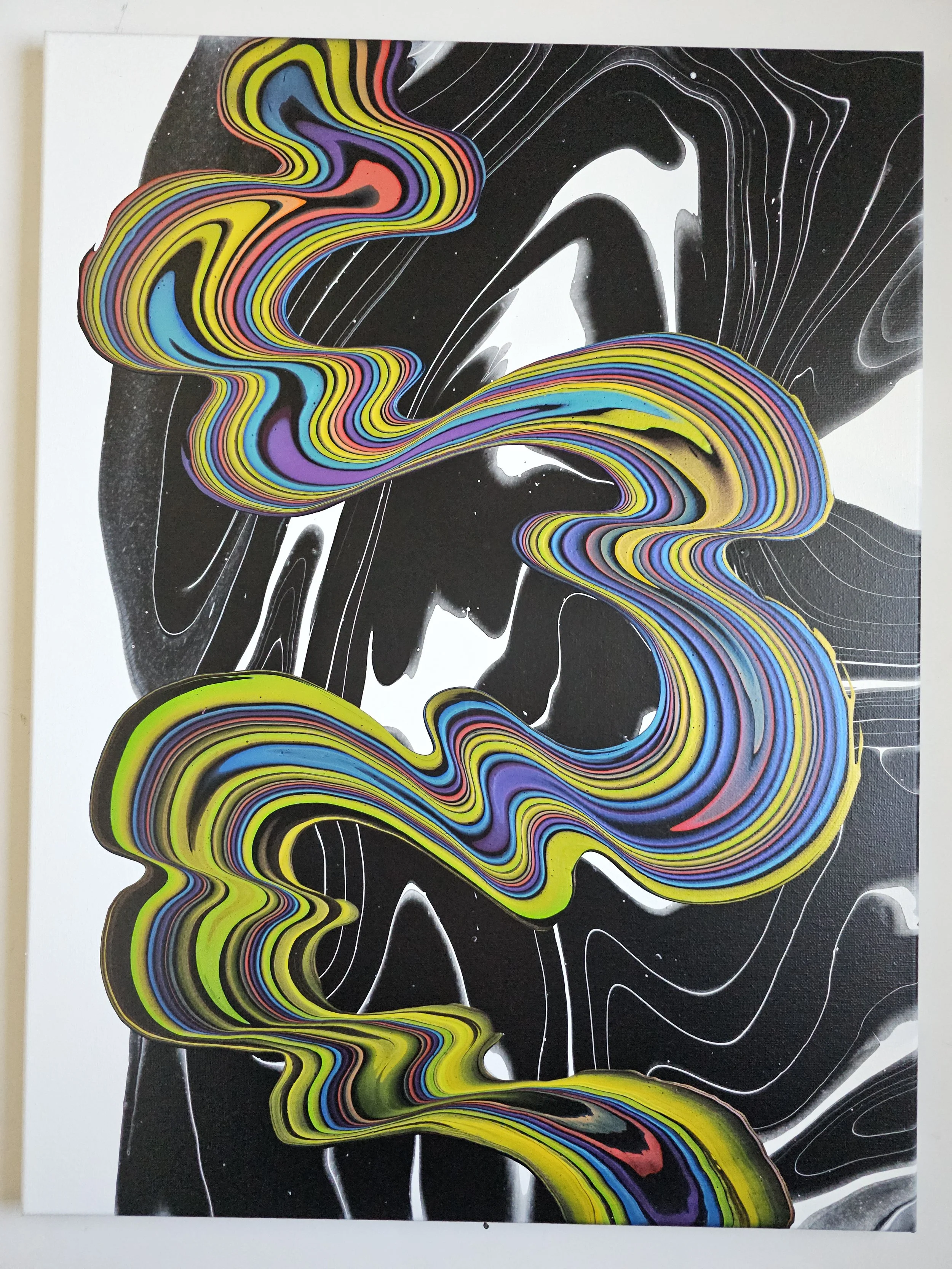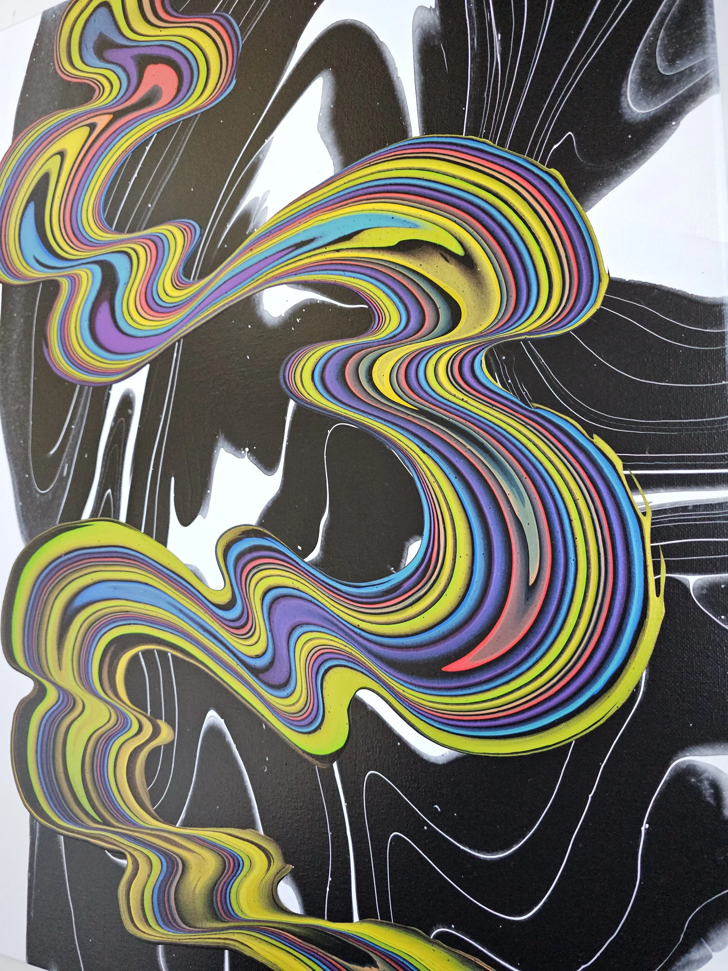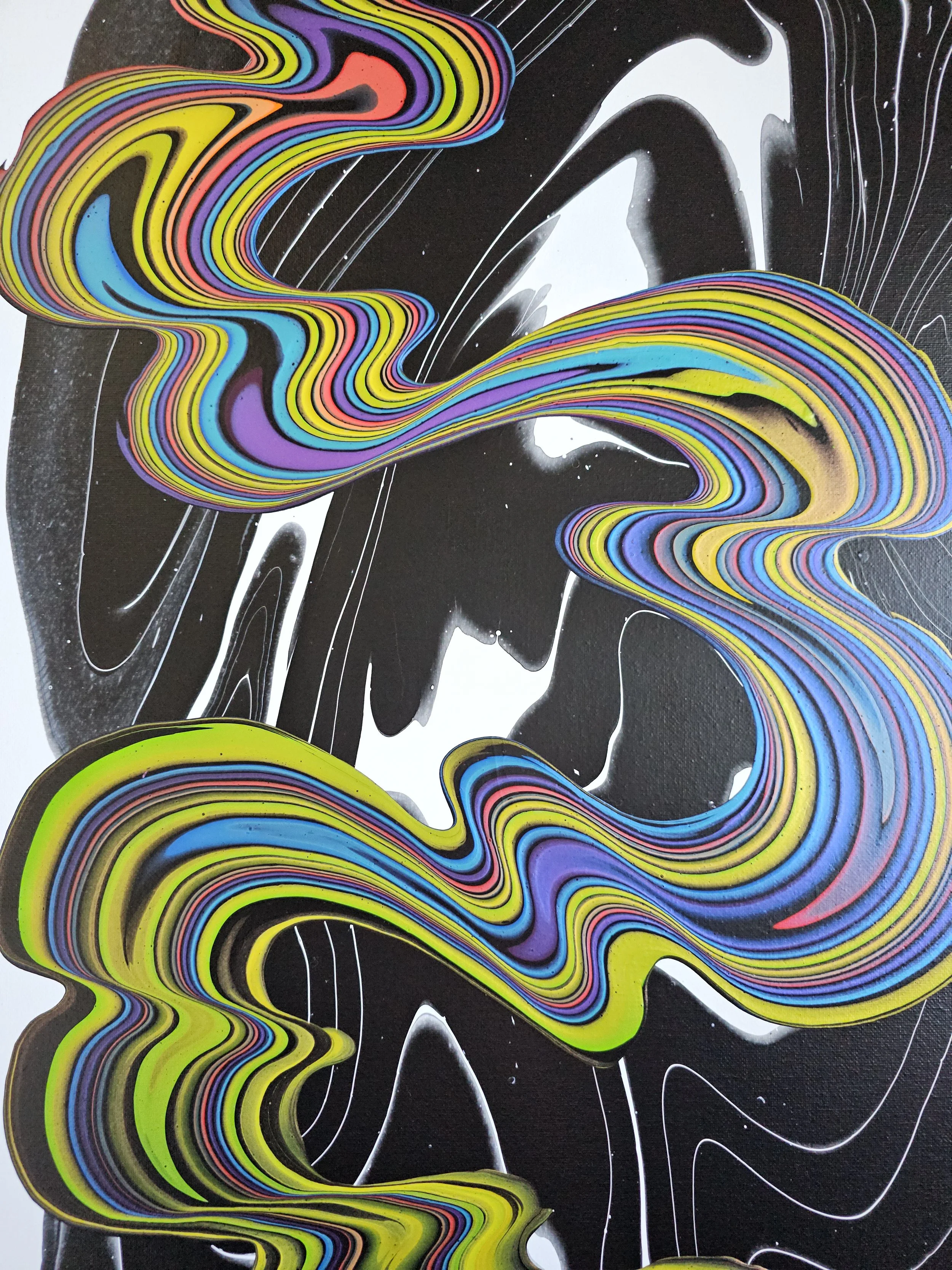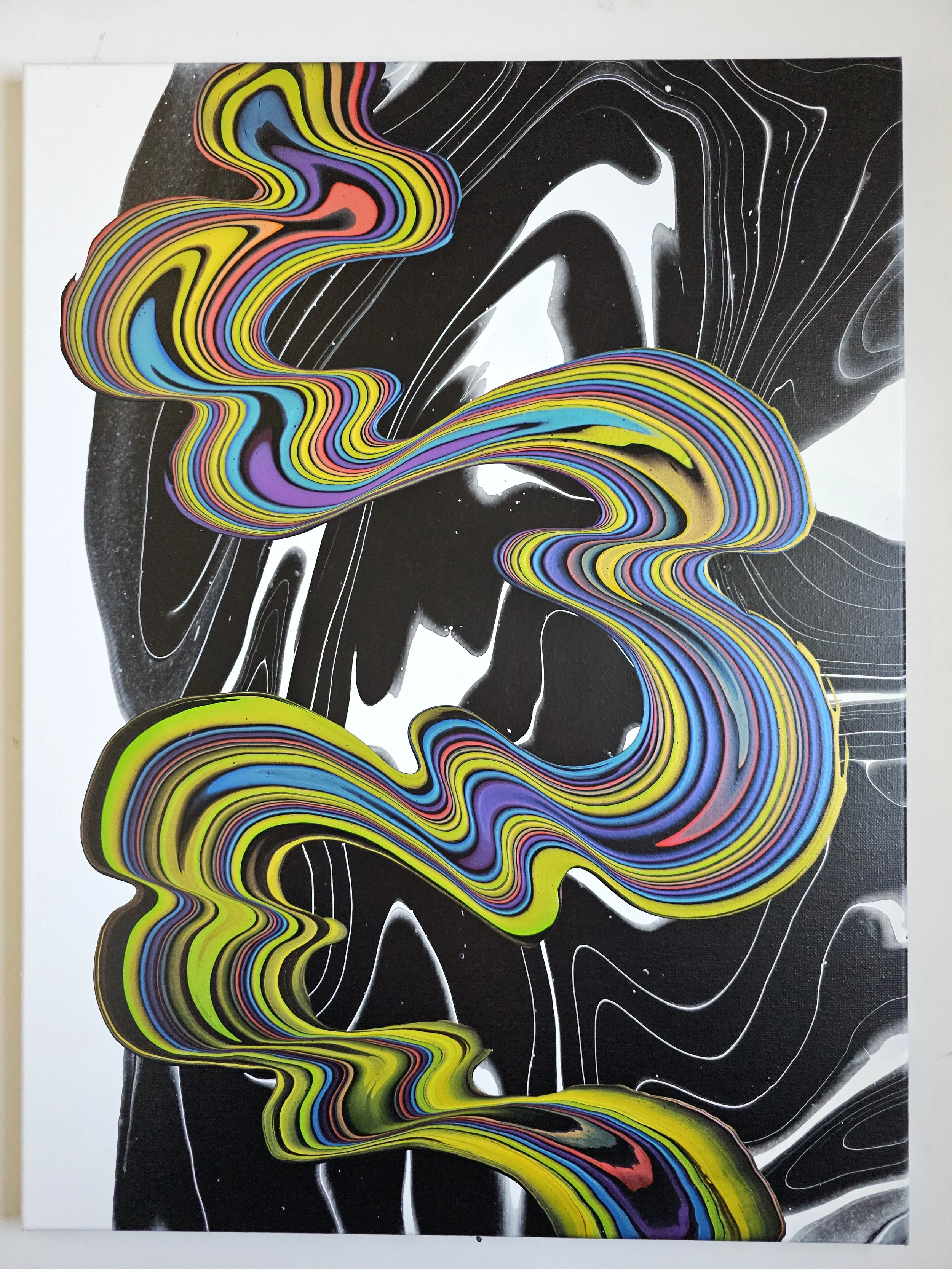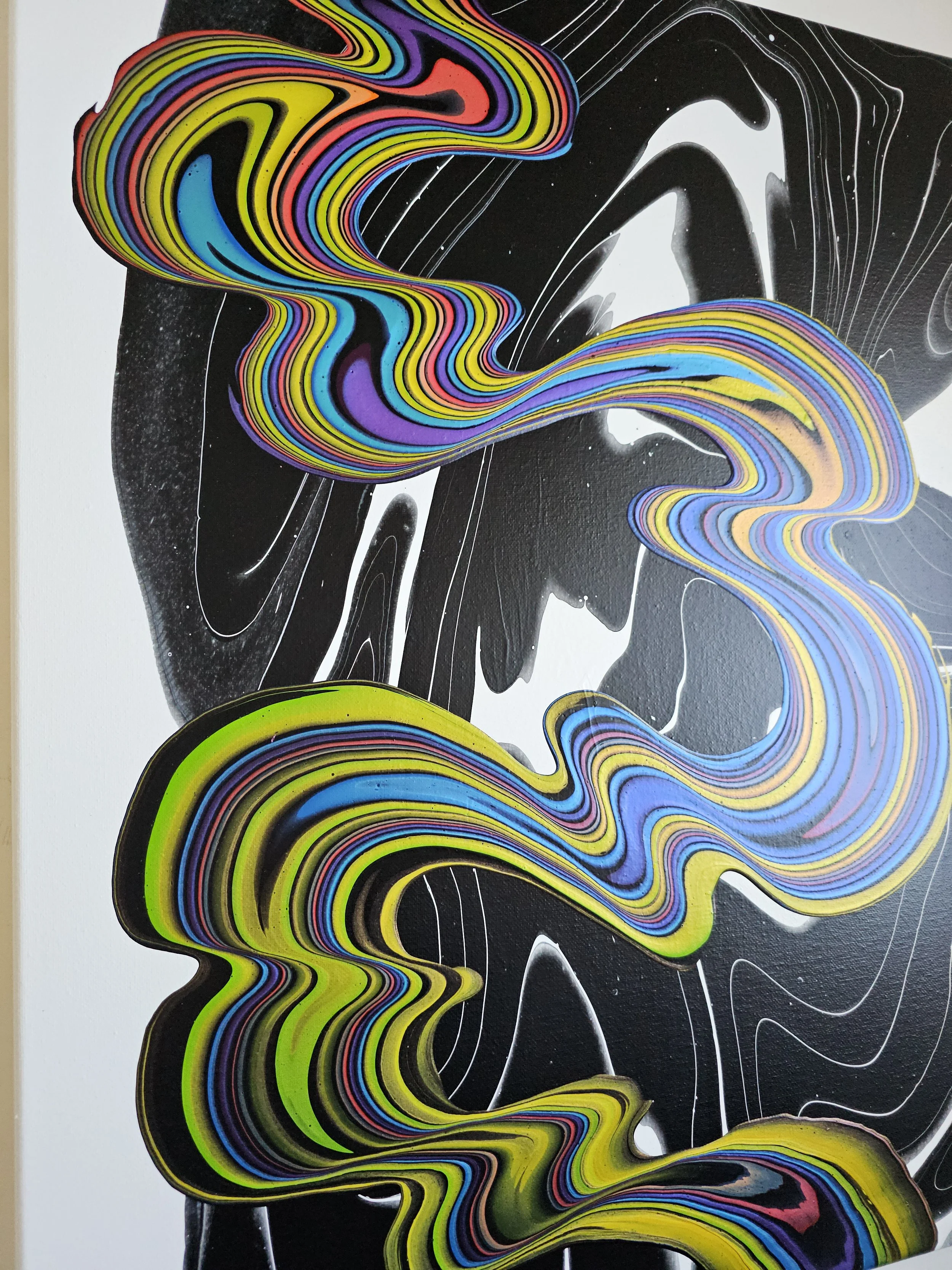 A bold fusion of movement and contrast, this piece captures the eye with its electrifying ribbons of color flowing across a sleek black-and-white backdrop. Vivid layers of neon yellow, cobalt, magenta, and lime twist and stretch like liquid energy, creating a sense of rhythm and motion that feels both playful and powerful. The glossy, marbled background adds depth and intrigue, allowing the vibrant streams to take center stage. This painting is a striking statement piece—perfect for adding a modern, dynamic pulse to any space.